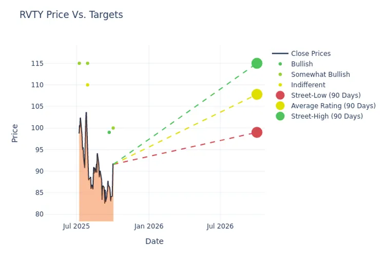 Revvity (NYSE:RVTY) underwent analysis by 5 analysts in the last quarter, revealing a spectrum of viewpoints from bullish to bearish. The table below summarizes their recent ratings, showcasing the evolving sentiments within the past 30 days and comparing them to the preceding months. BullishSomewhat BullishIndifferentSomewhat BearishBearish Total Ratings13100 Last 30D01000 1M Ago10000 2M Ago00000 3M Ago02100 Analysts provide deeper insights through their assessments of 12-month price targets, revealing an average target of $107.8, a high estimate of $115.00, and a low estimate of $99.00. A negative shift in sentiment is evident as analysts have decreased the average price target by 6.42%.